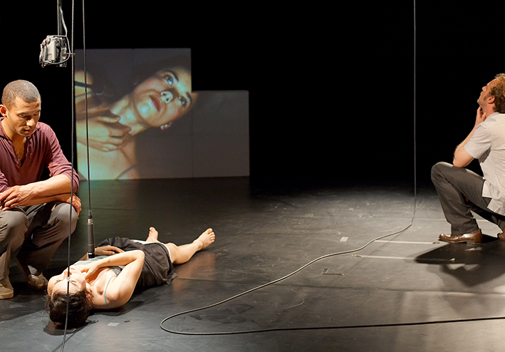About Identity"Who am I, who can I be, how do others see me?"Questions that have always revolved around the dilemma of humans searching for their own identity. "Vacuum in the Ocean" places these age-old questions in a new context. The consequence is the search for one's own identity and at the same time for the Other within us and in each individual: the longing of every individual to carry a complete and authentic self within. However, the question of identity in late modernity is increasingly posed in the context of work. The result is a composite patchwork identity.Three performers – two men and one woman – circle these questions and attempt to break free from their fragmented identities, only to realize that their own shadow, determined by imprinting, attribution, and personal dream constructs, cannot be overcome. They encounter each other as characters in a love triangle, yet they repeatedly relate their search for meaning to the central focus of their work identity, ensuring they will never come together.Intertwined with biographical fragments, "Vacuum in the Ocean" combines theater, dance, music, and projections into a multi-layered picture of shifting identity designs.